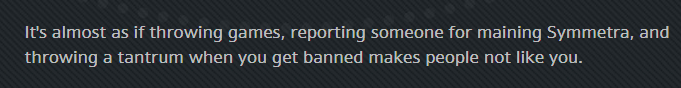 “È come se fare throwing nelle partite, riportare qualcuno per essere un Symmetra main, e fare i capricci quando vieni bannato, ti renda antipatico alla gente.”