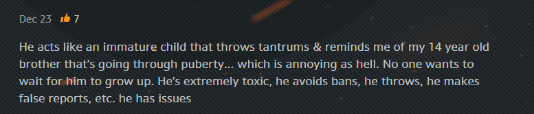“Si comporta come un bambino immaturo che fa i capricci e mi ricorda il mio fratellino quattordicenne che sta attraversando la pubertà… il che è insopportabile da morire. Nessuno vuole aspettare che lui cresca. È estremamente tossico, evita i ban, fa i capricci, effettua segnalazioni falsi, eccetera. Ha problemi.“