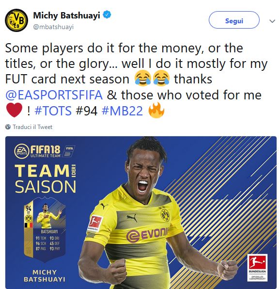La modalità Ultimate Team è uno dei punti di forza di FIFA, probabilmente la vera novità che ha permesso di scavare un solco tra il videogioco firmato EA e il rivale PES. Per chi ancora non la conoscesse, FUT è una particolare modalità di gioco nella quale un giocatore può costruirsi la propria squadra personale, mettendo insieme giocatori dello stesso campionato, o della stessa nazionalità oppure formare una squadra ibrida, tenendo d’occhio il parametro ‘intesa’ che permetterà ai giocatori di sfruttare a pieno le proprie abilità. I giocatori si trovano sotto forma di ‘carte’, ognuno con i propri parametri e possono essere ‘sbustati’ dai pacchetti, oppure comprati all’asta tramite i fut coins (la valuta del gioco) insieme a tutti gli altri giocatori di FUT. Una volta completata la propria squadra si possono sfidare in diverse modalità tutti i giocatori del mondo. Una modalità davvero coinvolgente che appassiona anche i calciatori reali. La prova arriva da Mtchy Batshuayi, attaccante del Chelsea in prestito al Borussia Dortmund che recentemente ha dichiarato: “molti giocatori fanno questo mestiere per i soldi, per i titoli o per la gloria… Beh, io lo faccio principalmente per la mia FUT card della prossima stagione”