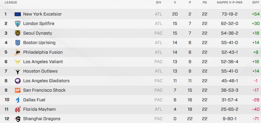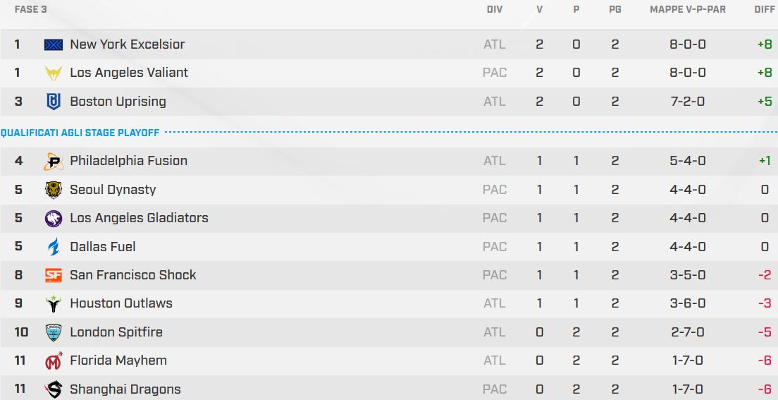Classifica Stage 2 Overwatch League: